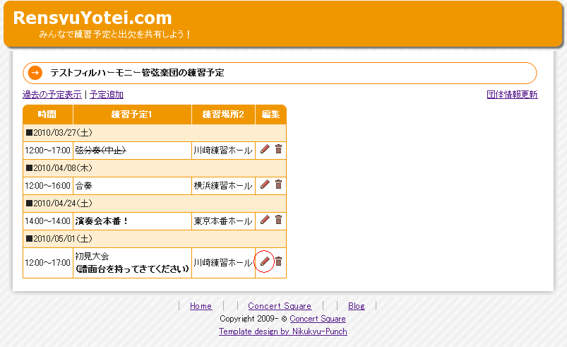 1)変更したい練習予定の鉛筆マークをクリックします。