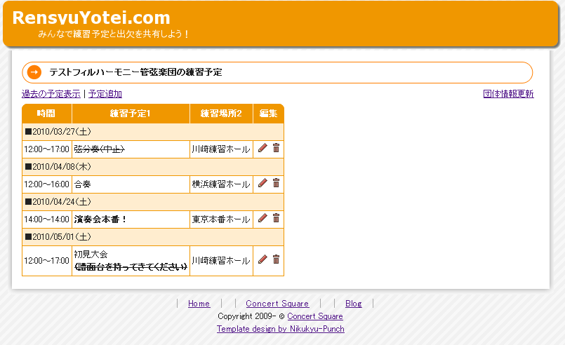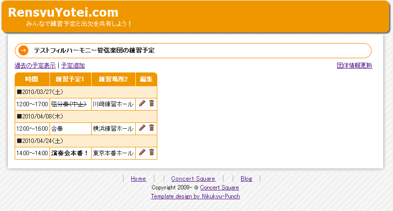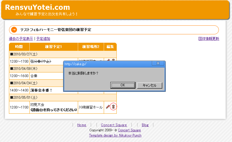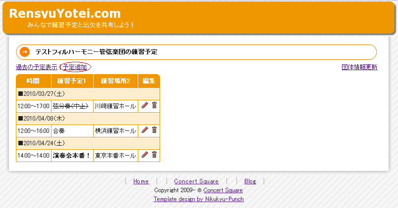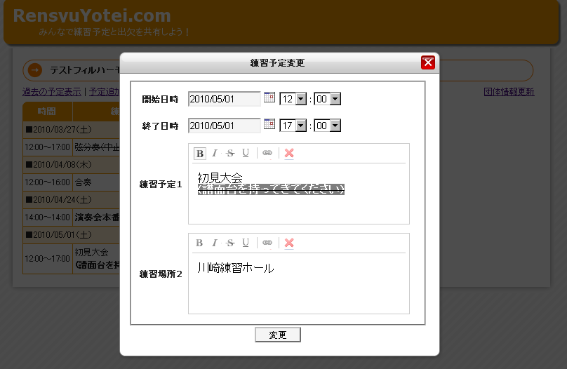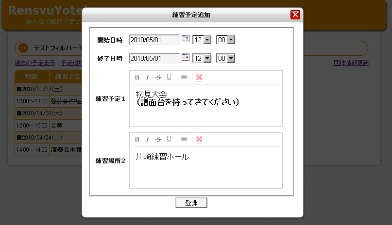 3)予定追加リンクを押してください。練習予定登録ウィンドウが表示されます。